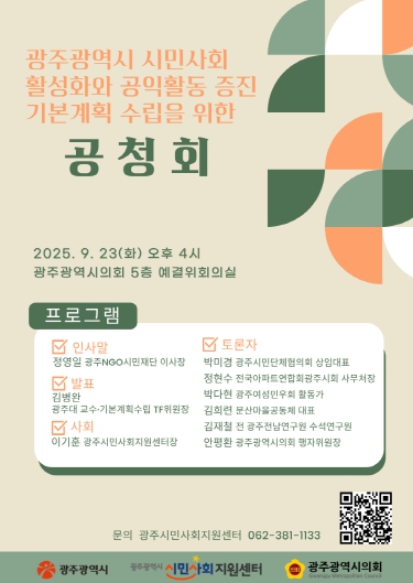 [뉴스다컴] 광주광역시는 23일 오후 4시 광주광역시의회 5층 예결위회의실에서 ‘광주광역시 시민사회 활성화와 공익활동 증진을 위한 기본계획(제1차, 2026~2028)’ 최종보고회 겸 공청회를 개최한다.