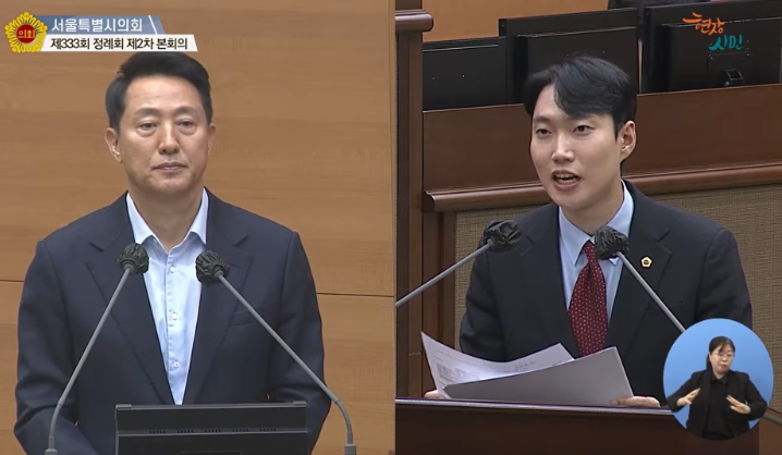 | ▲ 시정질문 중인 김규남 서울시의원(우)과 오세훈 서울시장(좌) |
