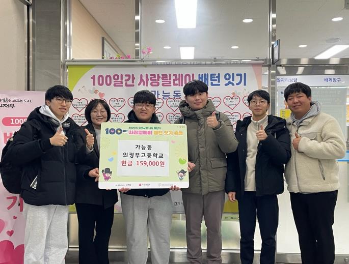 [뉴스다컴] 의정부시 가능동주민센터는 1월 7일 의정부고등학교 3학년 3반 졸업 예정 학생들이 교내 축제 활동을 통해 마련한 성금 15만9천 원을 관내 취약계층 지원을 위해 기부했다고 밝혔다.