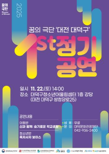 [뉴스다컴] 대덕문화관광재단은 오는 22일 대덕구청소년어울림센터에서 ‘2025 꿈의 극단 대덕구 정기공연’을 개최한다고 밝혔다.