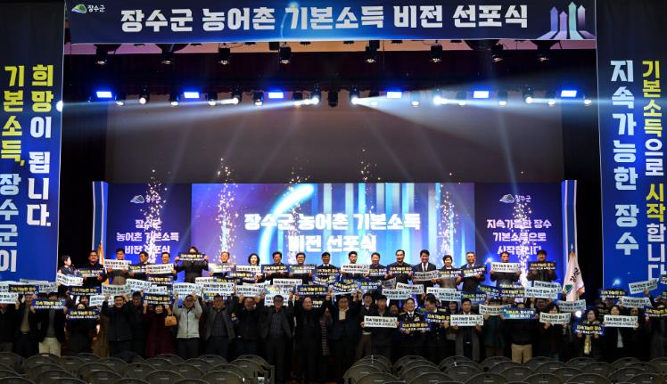 [뉴스다컴] 장수군은 8일 한누리전당 산디관에서 ‘농어촌 기본소득 비전 선포식’ 행사가 성황리에 개최됐다고 밝혔다.