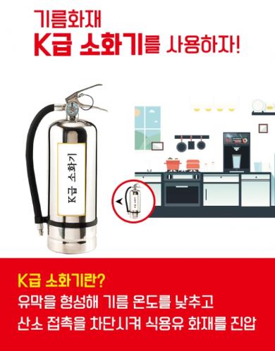 K급 소화기는 식용유 화재에 적합한 소화 약제를 분사해 기름 표면을 덮어 산소 공급을 차단하고 온도를 낮춰 재발화를 방지하는 효과가 있다. 사용 시에는 화염에 직접 분사하기보다 불이 난 기름 표면을 부드럽게 덮듯이 뿌리는 것이 중요하다.