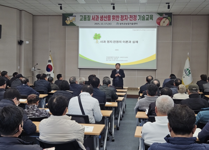 [뉴스다컴] 성주군은 12월 17일, 농업기술센터 2층 대강당에서 관내 사과재배 농가 100여명을 대상으로『고품질 사과 생산을 위한 정지·전정 기술교육』을 실시했다.
