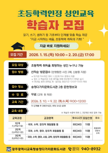 [뉴스다컴] 광주시교육청송정다가치문화도서관은 ‘2026학년도 초등학력인정 성인교육’ 프로그램을 운영한다.