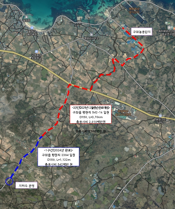 이번 사업은 2024년 6월에 착수해 제주시 구좌읍 행원리의 지하수관정에서 구좌농공단지까지 이어지는 노후 관로 구간을 전면 교체하는 내용을 포함하고 있으며, 총 사업비는 25억 5,000만 원이 투입됐다.