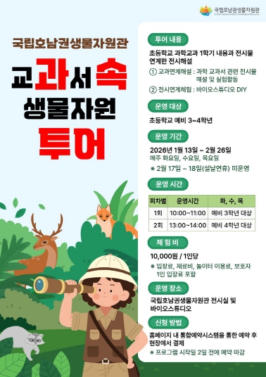 [뉴스다컴] 기후에너지환경부 산하 국립호남권생물자원관은 겨울방학을 맞이하여 예비 초등학교 3학년부터 4학년을 대상으로 교과서에 나오는 생물을 전시관에서 직접 만나보는 프로그램인 ‘교과서 속 생물자원 투어’를 1월 13일부터 2월 26일까지 운영한다고 밝혔다.