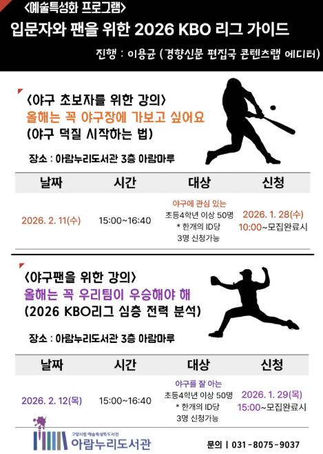 [뉴스다컴] 고양특례시 아람누리도서관은 오는 2월 11일과 12일 오후 3시부터 4시 40분까지 예술특성화 프로그램‘입문자와 팬을 위한 2026 KBO 리그 가이드’를 운영한다.