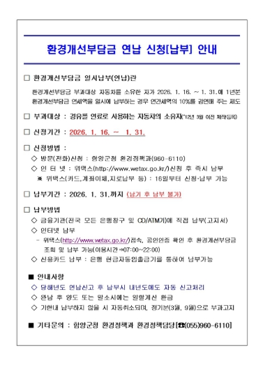 [뉴스다컴] 함양군은 경유를 연료로 사용하는 자동차(2012년 3월 이전 제작·등록에 한함)에 매년 3월과 9월 부과되는 환경개선부담금의 일시 납부(연납)를 1월 31일까지 접수 받고 있다.