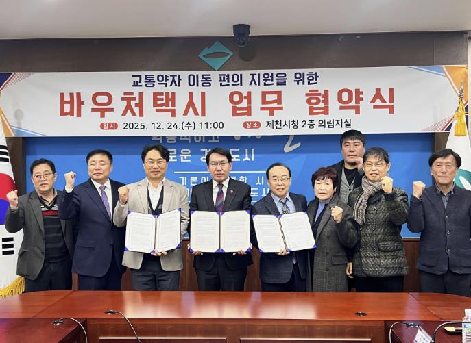[뉴스다컴] 제천시는 지난 24일 교통약자의 이동권 보장과 이동 편의 증진을 위해 청풍호콜센터, ㈜티머니 모빌리티와 바우처택시 업무협약을 체결했다.