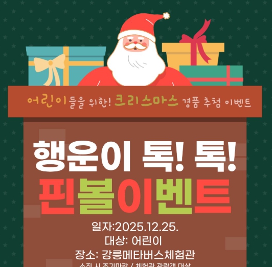 [뉴스다컴] 강릉과학산업진흥원은 12월 25일 크리스마스를 맞아 강릉 메타버스 체험관에서 어린이들을 대상으로 한 특별 크리스마스 이벤트를 개최한다고 밝혔다.