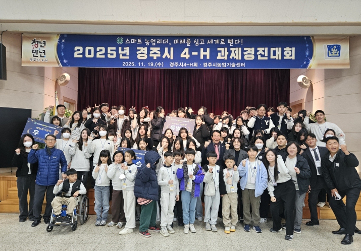| ▲ 2025 경주시 4-H 과제경진대회에 참석한 회원과 지도교사, 관계자들이 행사 종료후 함께 기념촬영을 하고 있다 |