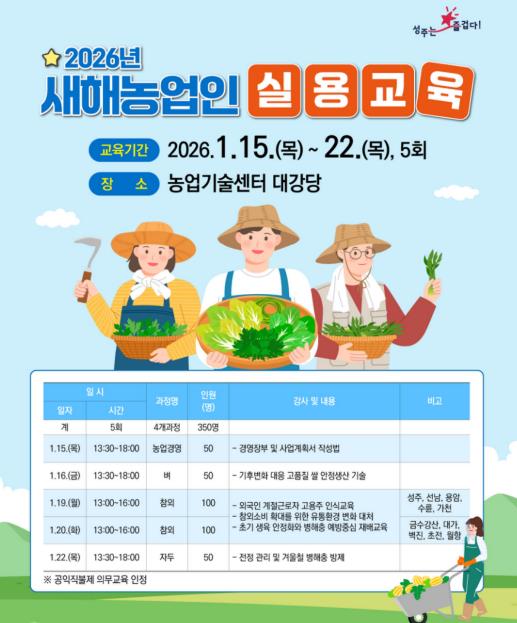 [뉴스다컴] 성주군은 오는 1월 15일부터 22일까지 농업기술센터 대강당에서 지역 농업인 350여명을 대상으로 '2026년 새해농업인실용교육'을 실시한다.