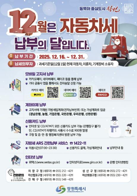 12월 제2기분 자동차세는 과세기준일인 12월 1일 현재 창원시에 등록된 자동차, 이륜자동차, 기계장비의 소유자에게 부과된다. 다만, 연납으로 이미 신고·납부한 차량과 연세액 10만 원 이하 차량은 6월에 전액 부과돼 이번 대상에서는 제외된다.