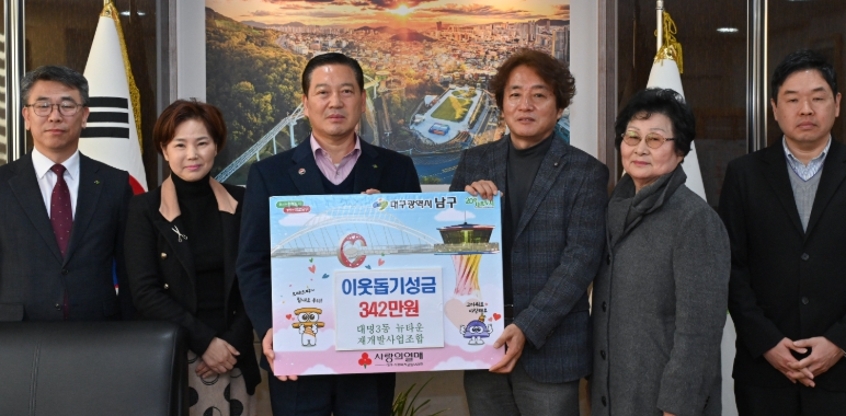 [뉴스다컴] 대구 남구는 대명3동 뉴타운 재개발사업 조합의 조합장(이대룡)을 비롯한 임원, 대의원 및 직원이 지난 2025년 12월 30일 연말을 맞아 어려운 이웃을 위해 써달라며 정성껏 모은 성금 342만원을 기탁했다고 밝혔다.
