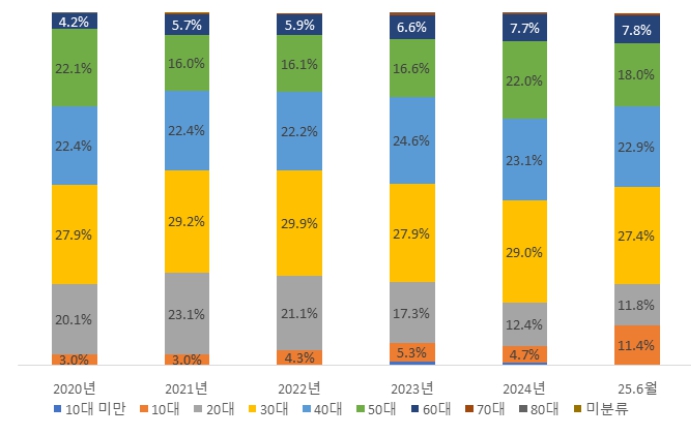 올해 상반기 연령별 출원 현황을 살펴보면, 남성 디자인 출원인은 50대 비중이 가장 높지만 여성은 30대 이하가 과반(50.6%, ‘25년 6월 기준)을 차지해 젊은 층의 비중이 압도적으로 높게 나타났다.
