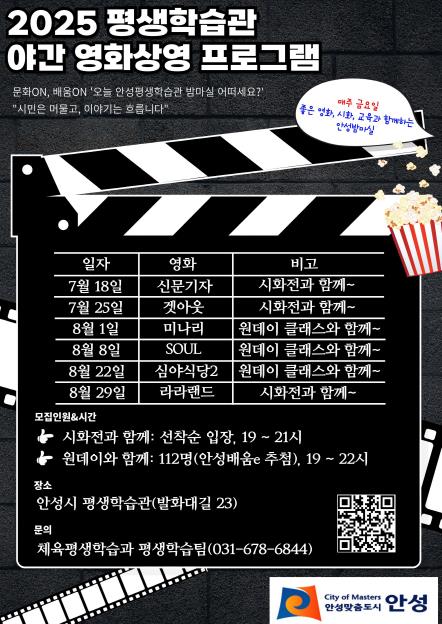 [뉴스다컴] 안성시는 하절기 무더위 쉼터 기능과 연계하여, 오는 18일부터 6주간 매주 금요일 오후 7시부터 9시까지 안성시 평생학습관에서 야간 영화 상영 프로그램을 운영한다. 이번 프로그램은 문화 향유와 배움이 어우러지는 시민 휴식 공간으로서 평생학습관의 기능을 강화하고, 무더운 여름밤 시민들에게 쉼과 즐거움을 제공할 예정이다.