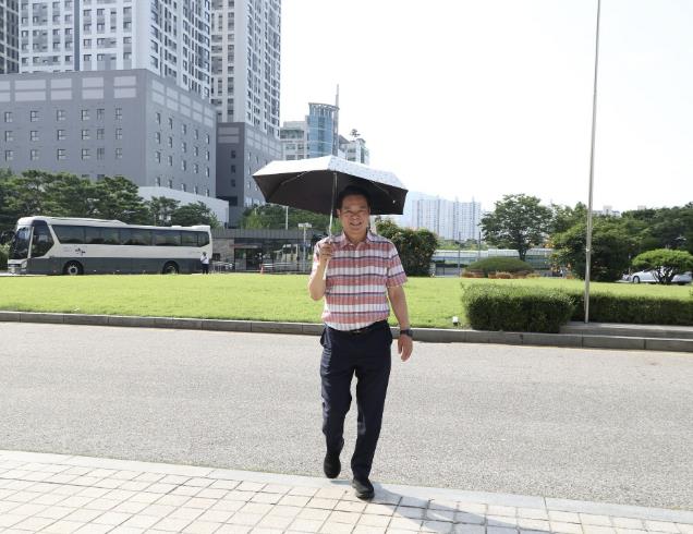 ▲ 최대호 안양시장이 쿨맵시 데이를 맞아 가벼운 옷차림에 양산을 쓰고 출근하고 있다 |