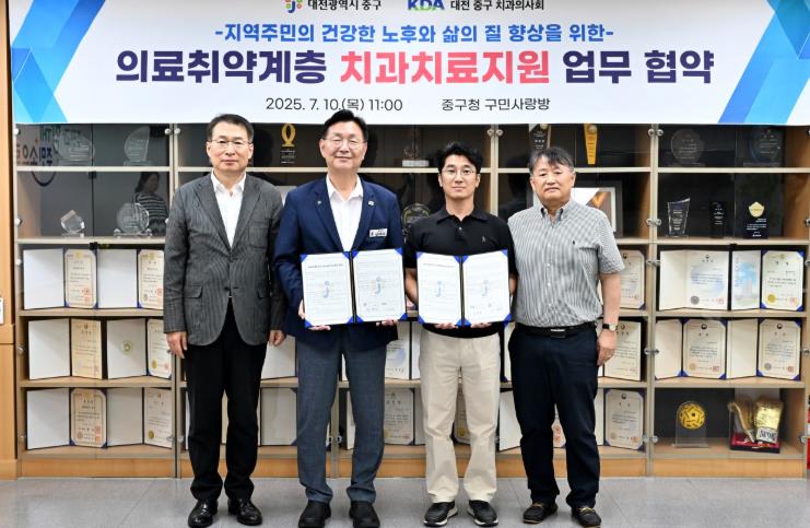 [뉴스다컴] 대전 중구는 10일 대전 중구 치과의사회와 의료취약계층의 치과치료 지원을 위한 업무협약을 체결했다고 밝혔다.
