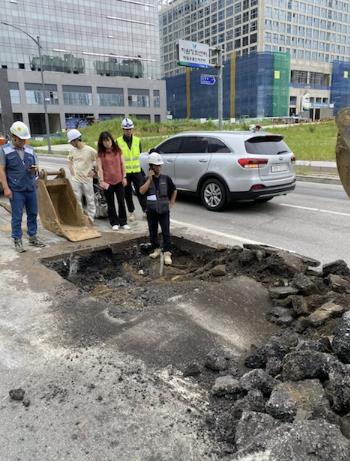 ▲ 과천시 지반 정밀조사 실시 후 공동 복구 작업을 하는 모습. |