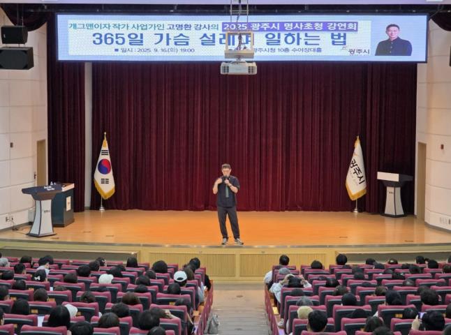 [뉴스다컴] 광주시는 지난 16일 오후 7시 시청 10층 수어장대홀에서 400여 명의 시민이 참석한 가운데 방송인·작가·사업가로 활동 중인 고명환 강사를 초청해 ‘365일 가슴 설레며 일하는 법’을 주제로 한 ‘2025년 제2회 명사 초청강연회’를 개최했다.
