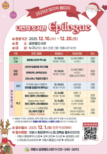 글로벌도서관 관계자는 “이번 행사 참여를 통해 올 한 해를 의미 있게 마무리하고, 가족과 함께 추억을 만들며 따뜻한 연말을 보낼 수 있게 될 것”이라며, “시민들의 많은 관심과 참여를 부탁드린다”라고 말했다.