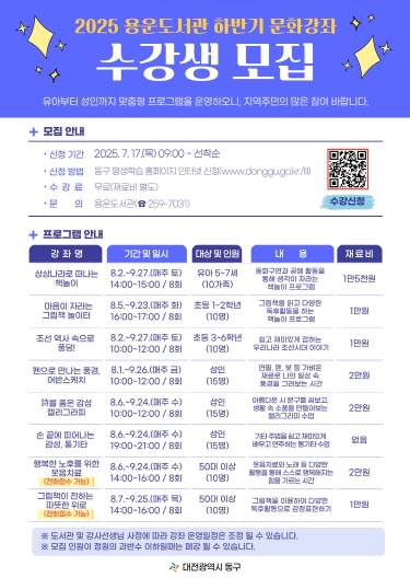 [뉴스다컴] 대전 동구는 오는 17일부터 31일까지 용운도서관 ‘하반기 문화강좌’ 수강생을 선착순 모집한다고 밝혔다.