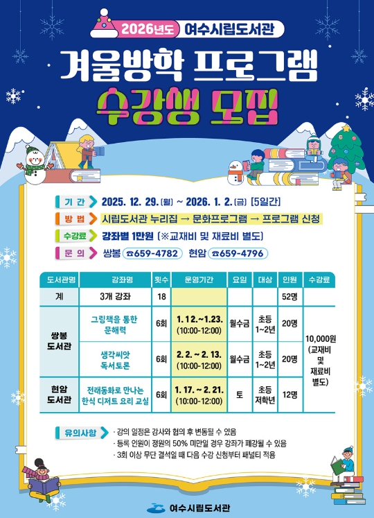 [뉴스다컴] 여수시립도서관은 오는 12월 29일부터 2026년 1월 2일까지 5일간 관내 초등학생을 대상으로 2026년 겨울방학 프로그램 수강생 52명을 선착순 모집한다.