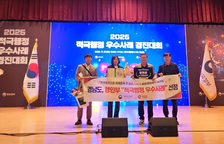 [뉴스다컴] 경남도가 지난 27일 열린 행정안전부 ‘2025년 적극행정 우수사례 경진대회’에서 ‘적극행정으로 국제중재 첫 승소, 138억 절감 도민에게 돌려줘’ 사례로 기관 표창(인사혁신처장상)을 받았다고 28일 밝혔다.