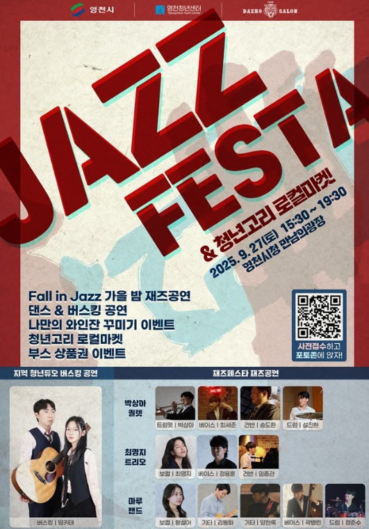 ‘문화로 만들어가는 청년이 살고 싶은 영천’을 주제로 열리는 이번 행사는 ▲청년 창업가가 직접 만든 다양한 물품 판매 ▲지역 청년 예술가의 댄스·버스킹 공연 ▲청년 재즈 밴드 3팀의 감각적인 재즈 공연 등 다채로운 프로그램으로 펼쳐진다.