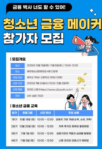 [뉴스다컴] 해미청소년문화의집은 오는 24일부터 2025년 청소년 특성화 프로그램‘청소년 금융 메이커’참가자를 모집한다고 밝혔다.