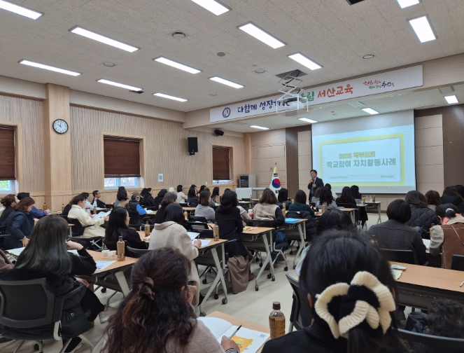[뉴스다컴] 충청남도서산교육지원청은 12월 10일 어울림실에서 서산 관내 54교 학부모회장과 학부모 70여 명이 참석한 가운데 학부모 교육 참여 사례 나눔 자리를 진행했다.