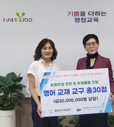 후원물품 전달식은 △평창군가족센터 △㈜브릴리언트컴퍼니 △국제다문화청소년협회의 후원으로 마련됐으며, 후원받은 금30,000,000(금삼천만원) 상당의 영어 교재와 교구 30점은 평창군가족센터와 협력하여 평창 관내 취약계층 가정으로 전달될 예정이다.