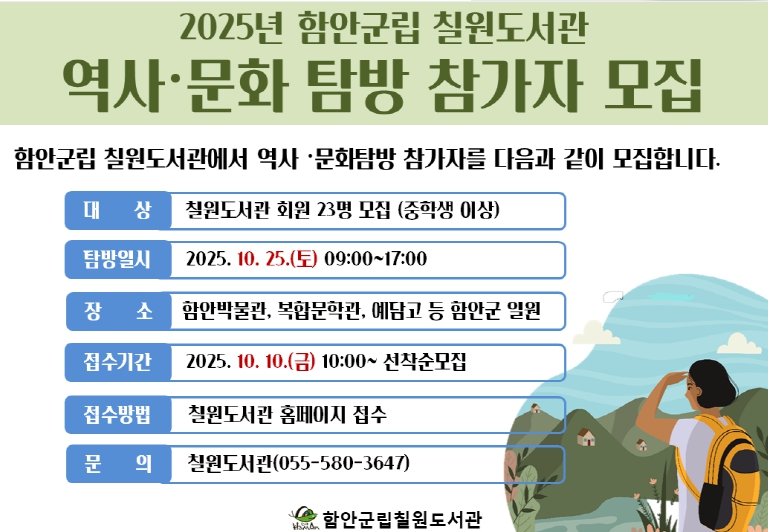 [뉴스다컴] 함안군립 칠원도서관이 '2025년 하반기 역사·문화탐방' 프로그램 참가자를 모집한다.