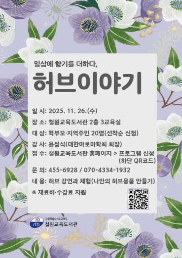 이번 프로그램은 △미술과 철학(3회) △허브 이야기(1회)로 구성되며, 철원교육도서관 3교육실에서 오전 10시부터 12시까지 진행된다. 각 회차별 20명씩, 총 40명이 참여할 수 있다.