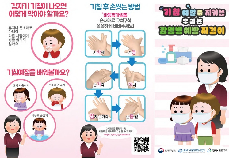 특히, ‘기침 예절을 지키는 우리는 감염병 예방 지킴이’라는 제목의 전단지는 학생 눈높이에 맞춘 그림과 간단한 문구로 구성되어 있으며, 교실·보건실·급식실 등 학교 내 다양한 공간에 비치되어 학생들의 자율적 감염병 예방 실천을 유도할 예정이다.