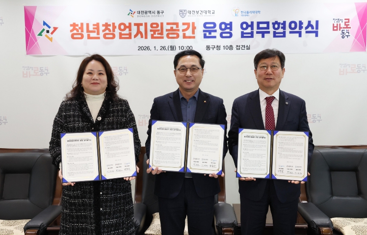 [뉴스다컴] 대전 동구는 26일 대전보건대학교(총장 이정화)‧한국폴리텍Ⅳ대학 대전캠퍼스(학장 양형규)와 청년창업지원공간 운영을 위한 업무협약(MOU)을 체결했다고 밝혔다.
