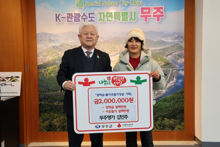 [뉴스다컴] 무주군 무주읍에 위치한 한식 전문점 ‘무주명가’의 김민주 사장이 지난 14일 무주군에 이웃돕기 성금 1백만 원, (재)무주군교육발전장학재단에 장학금 1백만 원 등 총 2백만 원을 기탁했다.