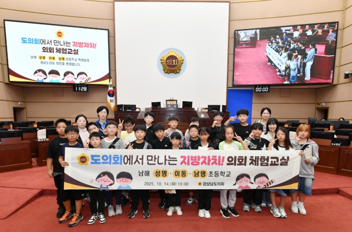 [뉴스다컴] 경상남도의회는 14일 남해 소규모 공동학교(성명초, 이동초, 남명초) 5학년 학생 20명을 대상으로 도의회에서 만나는 지방자치! 의회체험교실을 개최했다.