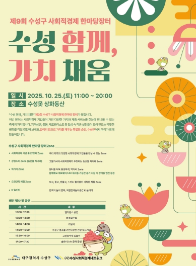 [뉴스다컴] 대구 수성구는 오는 25일 오전 11시부터 오후 8시까지 수성못 상화동산 일대에서 사회적경제기업의 지속적인 성장과 자립 기반을 지원하고, 사회적 가치 실현을 주민과 함께 공유하기 위한 ‘2025 제9회 수성구 사회적경제 한마당 장터’를 개최한다고 밝혔다.