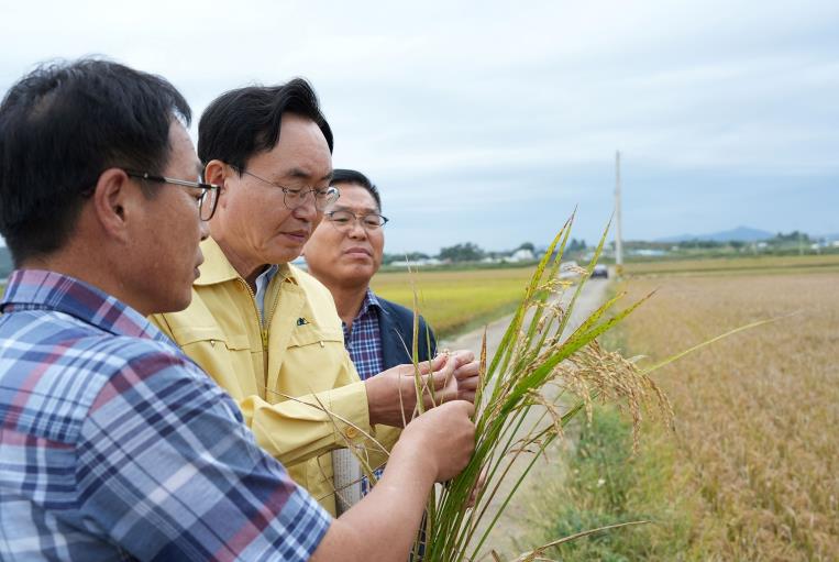 | ▲ 나주시가 벼 깨씨무늬병 피해를 본 농가에 복구비를 지원한다. 사진은 윤병태 시장(가운데)이 벼 깨씨무늬병 상태를 살피고 있는 모습. |