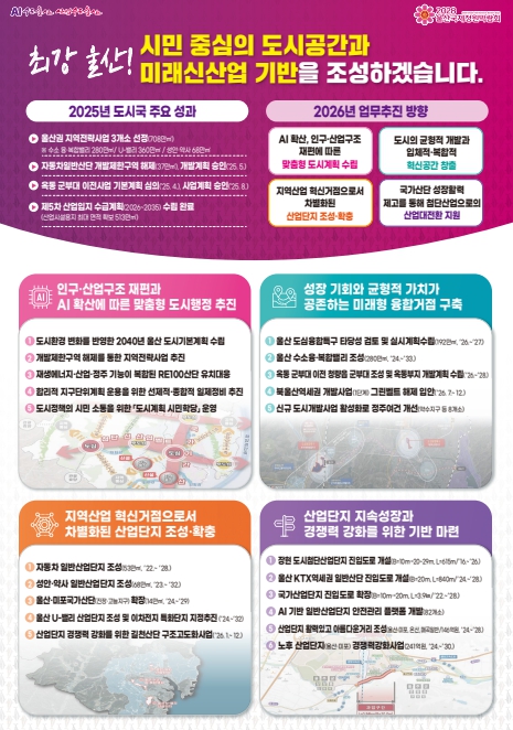 [뉴스다컴] 울산시가 ‘최강 울산!’ 완성을 위한 시민 중심의 도시공간 조성과 미래 신산업 기반 구축을 목표로 2026년 도시 분야 정책을 추진한다.