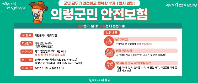 [뉴스다컴] 의령군은 일상생활 중 예기치 못한 재난과 사고로부터 군민의 생활 안정을 지원하기 위해 ‘2026년 군민안전보험’에 갱신 가입하고, 1월 15일부터 본격 운영에 들어간다고 밝혔다.