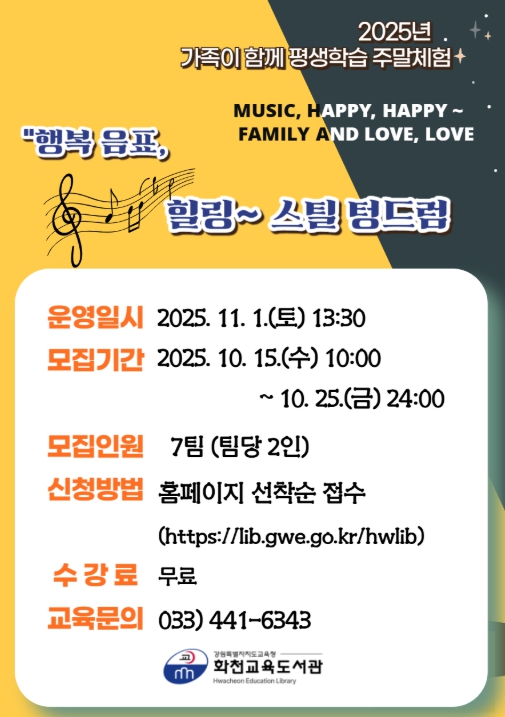 [뉴스다컴] 강원도교육청 화천교육도서관은 군민을 대상으로 2025년 11월 평생학습 주말체험 ‘늦가을, 가족 음악 특강: 행복 음표, 힐링 스틸 텅드럼’을 운영한다.