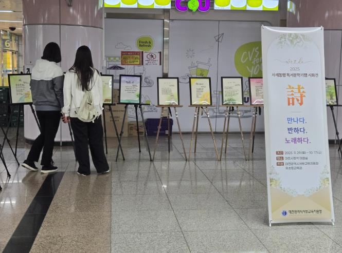 [뉴스다컴] 대전서부교육지원청은 9월 29일부터 10월 17일까지 대전시청역 대합실(대전 서구 둔산중로 55)에서 2025학년도 사제동행 독서문학기행 참가자 28명의 시화 작품 전시회 '詩-만나다. 반하다. 노래하다.'