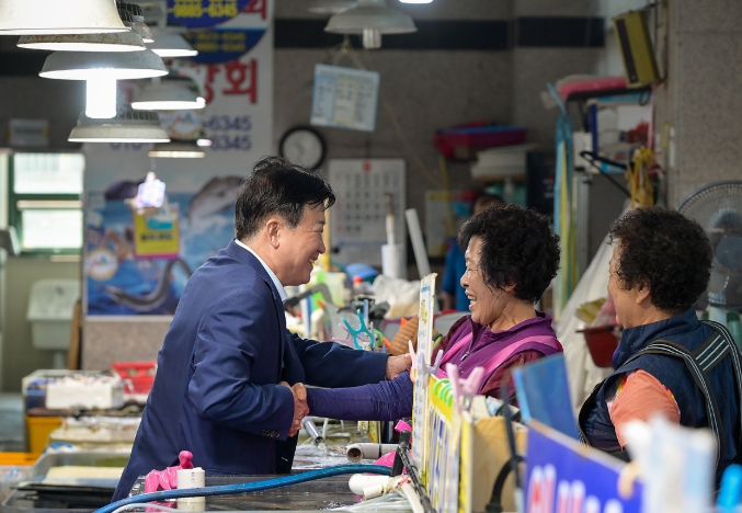 ▲ 정기명 여수시장이 지난 22일 추석 명절을 앞두고 관내 전통시장을 찾아 민생회복 소비쿠폰 조기 사용을 독려하고 소상공인을 격려했다. |