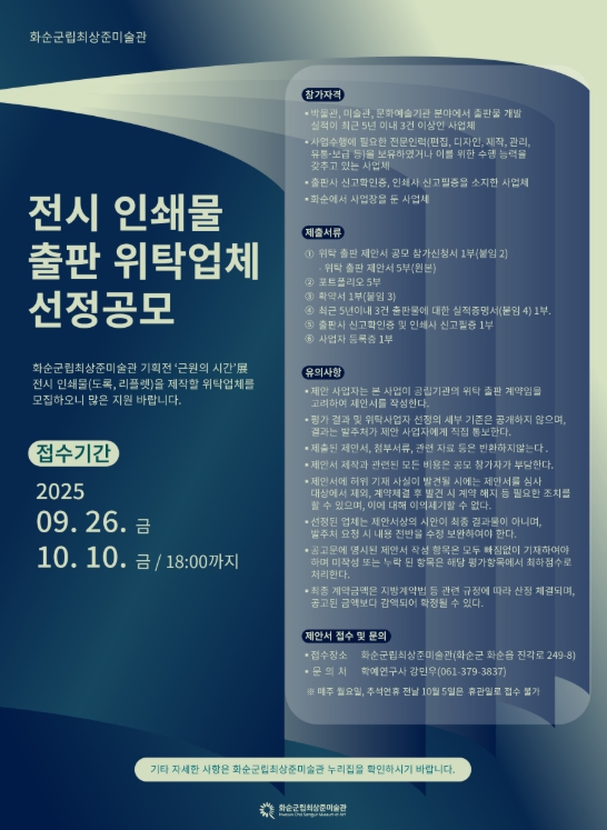 [뉴스다컴] 화순군은 29일 화순군립최상준미술관 기획전 ‘근원의 시간’ 展의 전시 인쇄물(도록, 리플렛) 제작을 전문적으로 수행할 위탁업체를 공개 모집한다고 밝혔다.