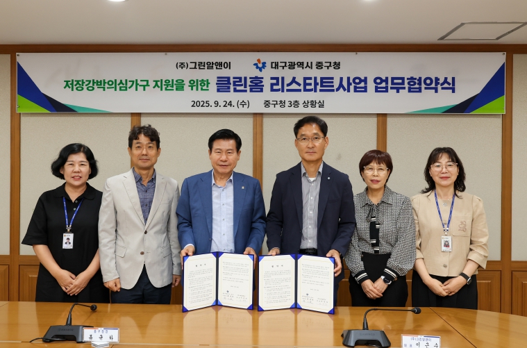 [뉴스다컴] 대구 중구와 ㈜그린알앤이(대표 이근수)는 24일 저장강박의심가구 주거환경 개선과 복지안전망 강화를 위한 ‘클린홈 리스타트 사업’ 업무협약을 체결했다.