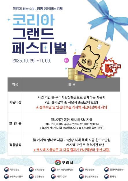 [뉴스다컴] 구리시는 오는 10월 29일부터 11월 9일까지 열리는 ‘2025 코리아 그랜드 페스티벌’ 기간 동안 구리사랑상품권 5% 추가 적립금 사업을 추진한다고 밝혔다.