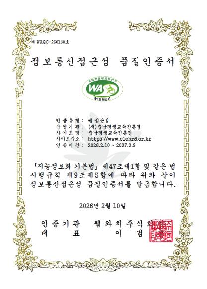 [뉴스다컴] 충남평생교육진흥원은 과학기술정보통신부 지정 국가공인 인증기관(㈜웹와치)으로부터 정보통신접근성 품질인증을 획득했다고 밝혔다.