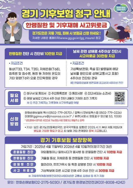 군 관계자는 “예기치 못한 폭염·한파 등으로 건강 피해를 입은 군민은 반드시 경기 기후보험을 활용해 주시기 바란다”며 “군민들이 제도를 몰라 보상을 받지 못하는 일이 없도록 적극 안내하겠다”고 말했다.